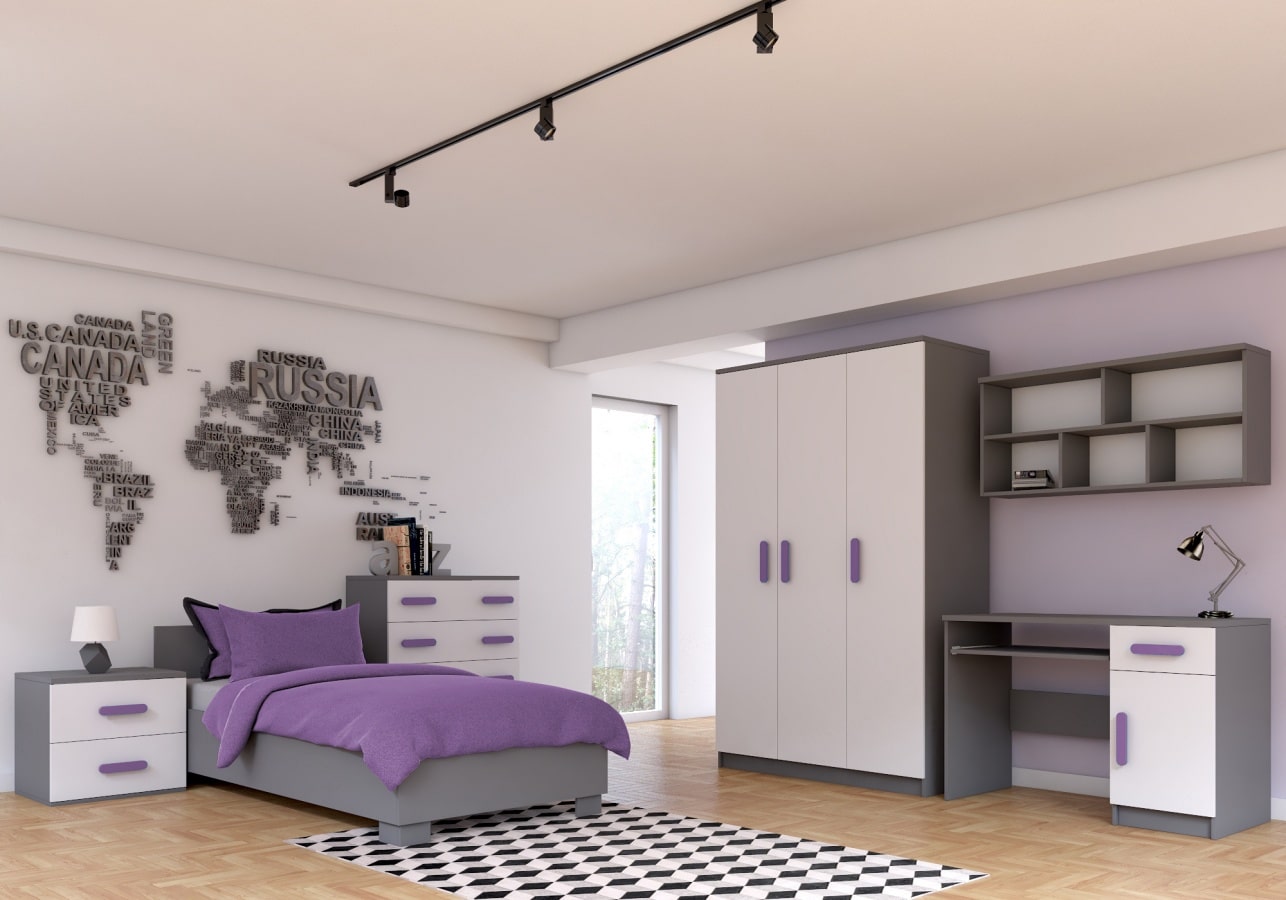 NODI GREY to zbiór nowoczesnych, funkcjonalnych i stylowych mebli przeznaczonych dla młodszych użytkowników. Kolekcja charakteryzuje się wysoką jakością wykonania oraz atrakcyjnym designem, który doskonale wpisuje się w gusta i potrzeby współczesnej młodzieży. Seria wyróżnia się elegancką kolorystyką, w której dominują grafit w połączeniu z bielą i kolorowymi detalami w postaci uchwytów. Te stonowane, nowoczesne kolory tworzą harmonijną i spokojną atmosferę, która doskonale wpisuje się w gusty młodzieży. Kolekcja mebli młodzieżowych NODI GREY oferuje szeroką gamę brył, takich jak łóżka, biurka, szafy, regały czy komody. Dają one możliwość tworzenia różnorodnych kompozycji w pokoju młodzieżowym, dostosowanych do indywidualnych potrzeb i preferencji.