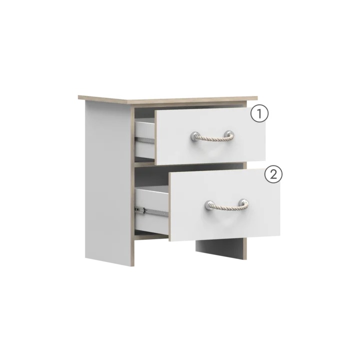 Meble z kolekcji FLARON charakteryzują dekoracyjne uchwyty sznurkowe w stylu marynarskim. Korpus i fronty wykonane są z płyty laminowanej 16 mm najwyższej jakości. Obrzeża wykończone okleiną ABS, która chroni meble przed zarysowaniami, uszkodzeniami, wilgocią i wysoką temperaturą. Korpus oraz fronty wykonane są w kolorze białego matu. Obrzeża mebli natomiast są w kolorze dąb sonoma. Komplet składa się z brył takich jak: biurko, regał, komoda, szafa, stolik nocny, łóżko o powierzchni spania 90×200 cm oraz stelaż drabinkowy do łóżka.