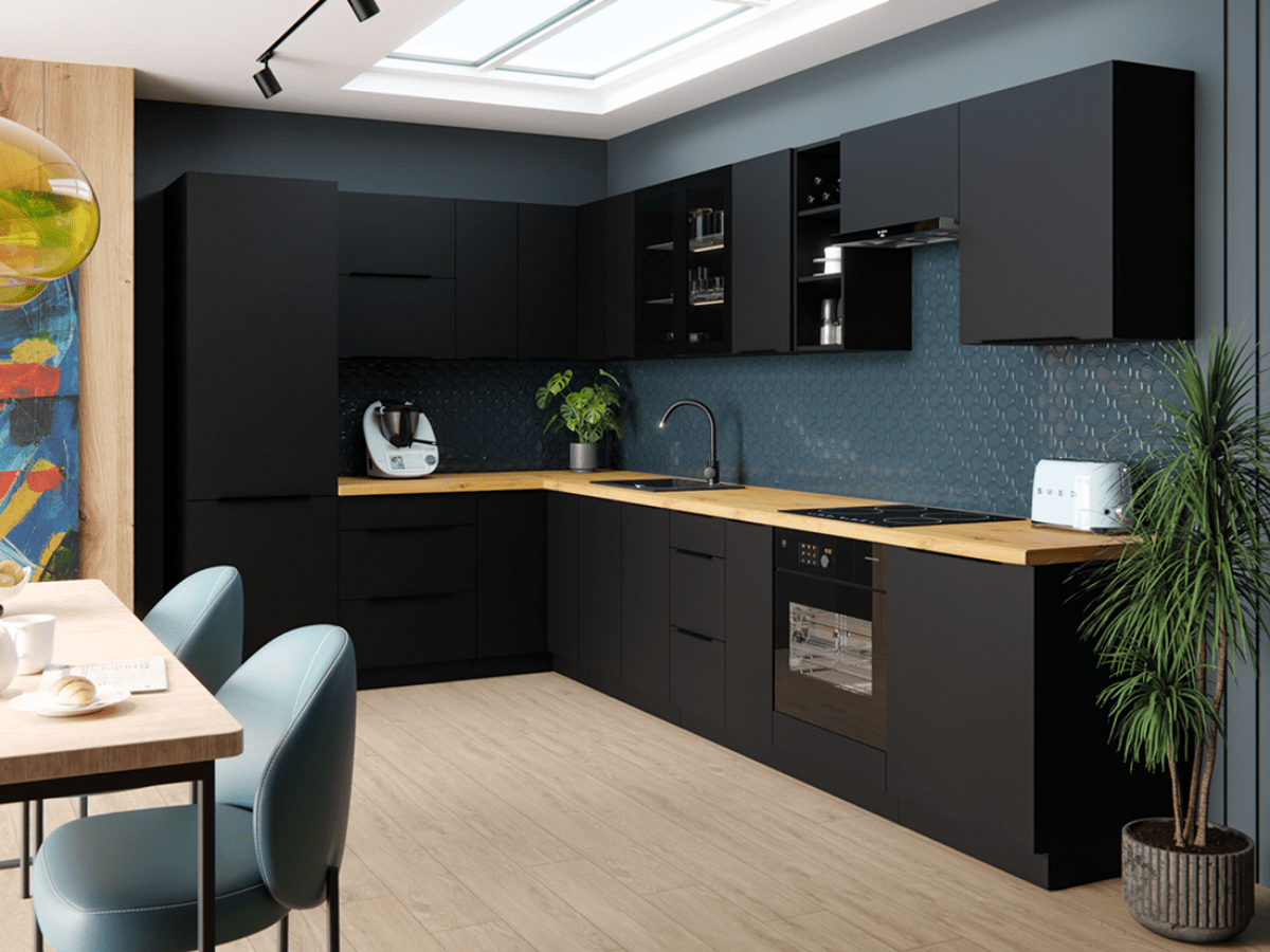 Wszystkie nowoczesne fronty są starannie wykonane z płyty laminowanej, oklejoną czarnym matowym ABS-em. Fronty doskonale sprawdzają się w warunkach panujących w kuchni, dzięki czemu zapewniają niezawodność na wiele lat i zachwycają estetycznym wykończeniem.
