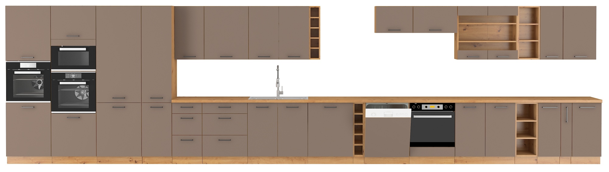 Dzięki uniwersalnemu ustawieniu, meble kuchenne dopasują się do wnętrza każdej kuchni. Nietuzinkowe fronty oraz korpusy w dekorze modnego drewna, nadają meblom kuchennym szczególnego charakteru. Czarne uchwyty podkreślają elegancję szafek kuchennych.