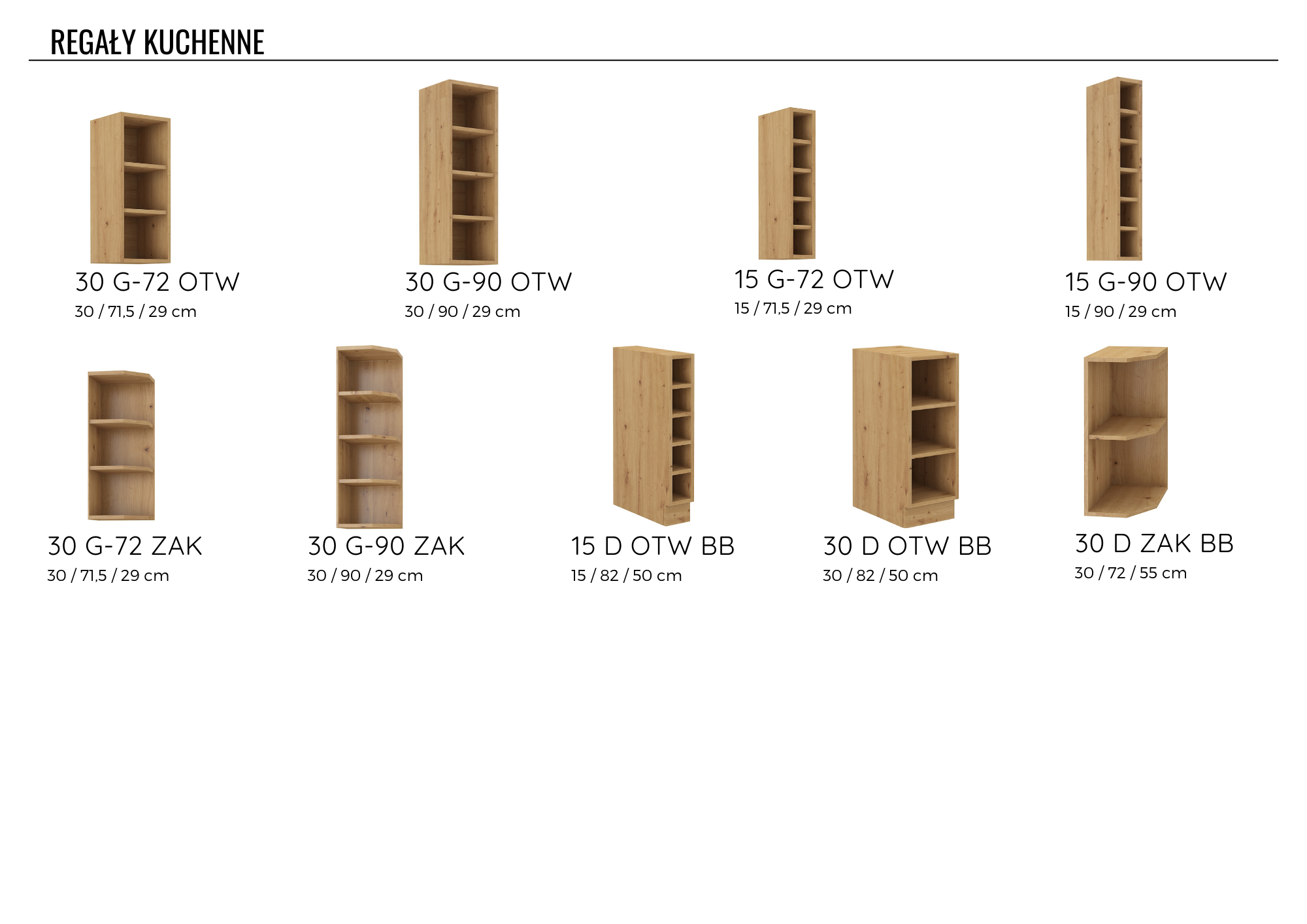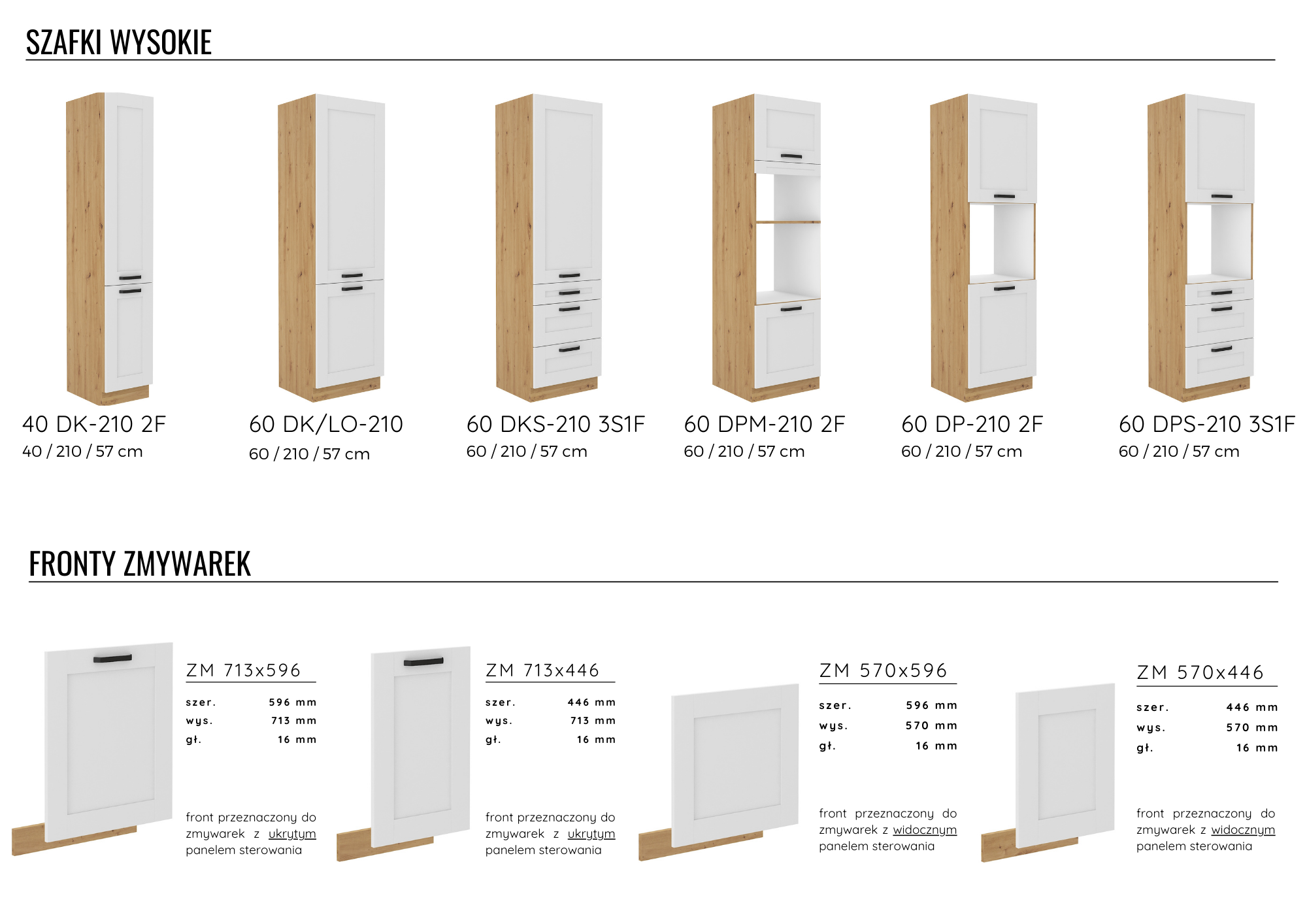 • Korpusy szafek dolnych wykonane z płyty wiórowej laminowanej grubości 16 mm w kolorze dąb artisan lub białym. Głębokość korpusów szafek stojących z frontem – 52 cm.