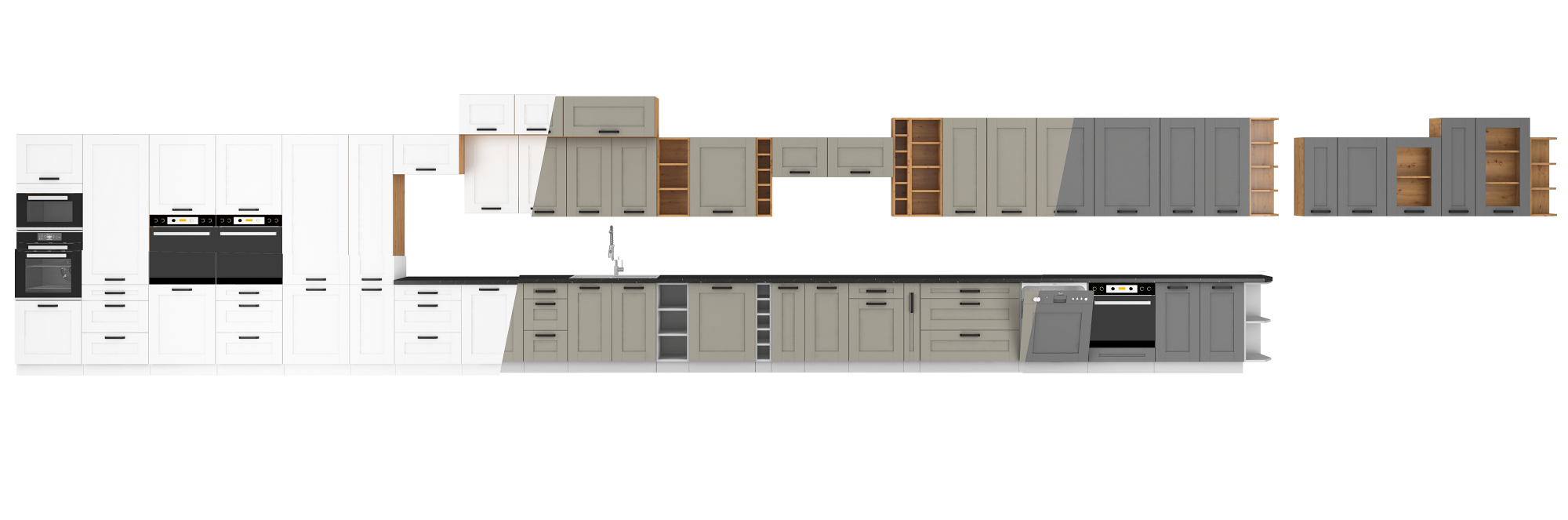 Dzięki uniwersalnemu ustawieniu, meble kuchenne dopasują się do wnętrza każdej kuchni. Trzy kolory frontów oraz korpusy w dwóch kolorach wykończone w dębowym dekorze lub klasycznej bieli, nadają meblom kuchennym szczególnego charakteru. Czarne, metalowe uchwyty podkreślają elegancję szafek kuchennych.