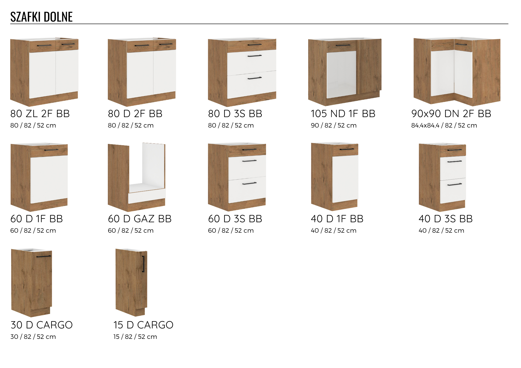 - Korpusy szafek dolnych wykonane z płyty wiórowej laminowanej grubości 16 mm w kolorze dąb lancelot. Głębokość korpusów szafek stojących z frontem – 52 cm.