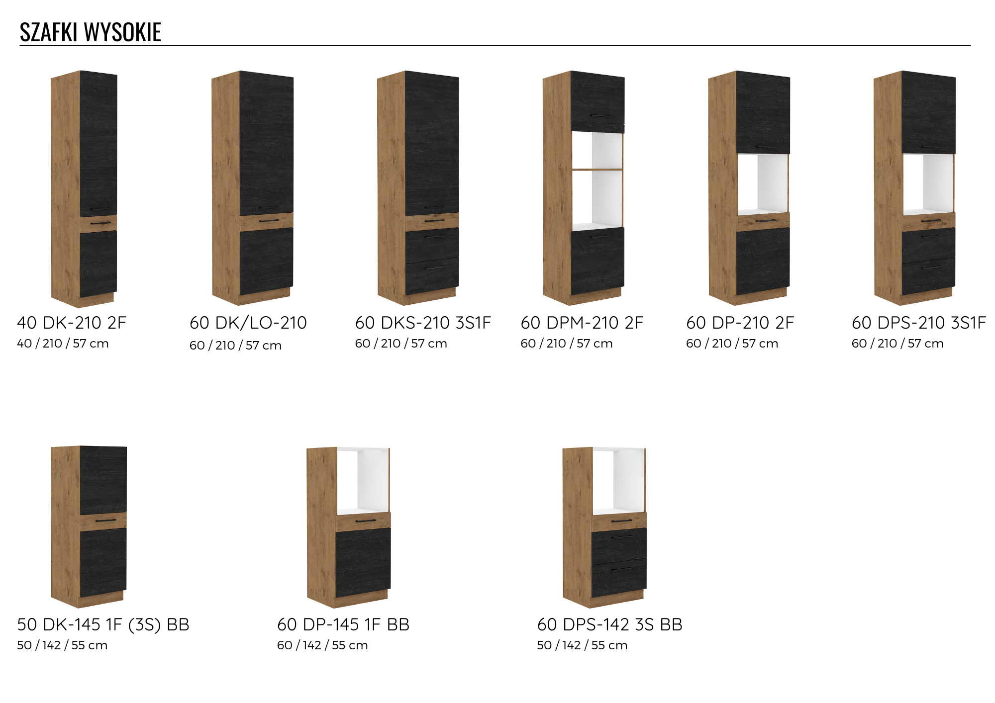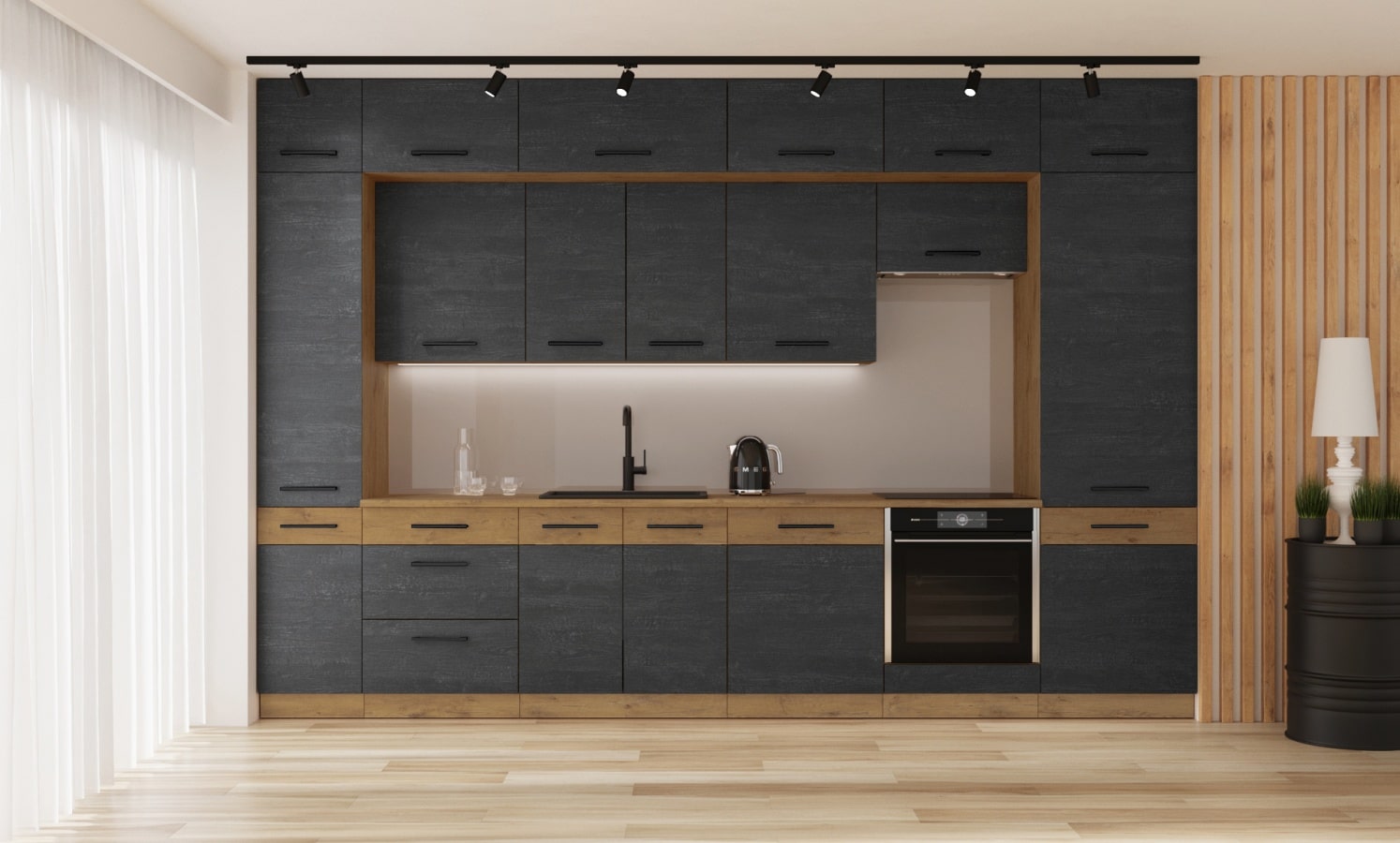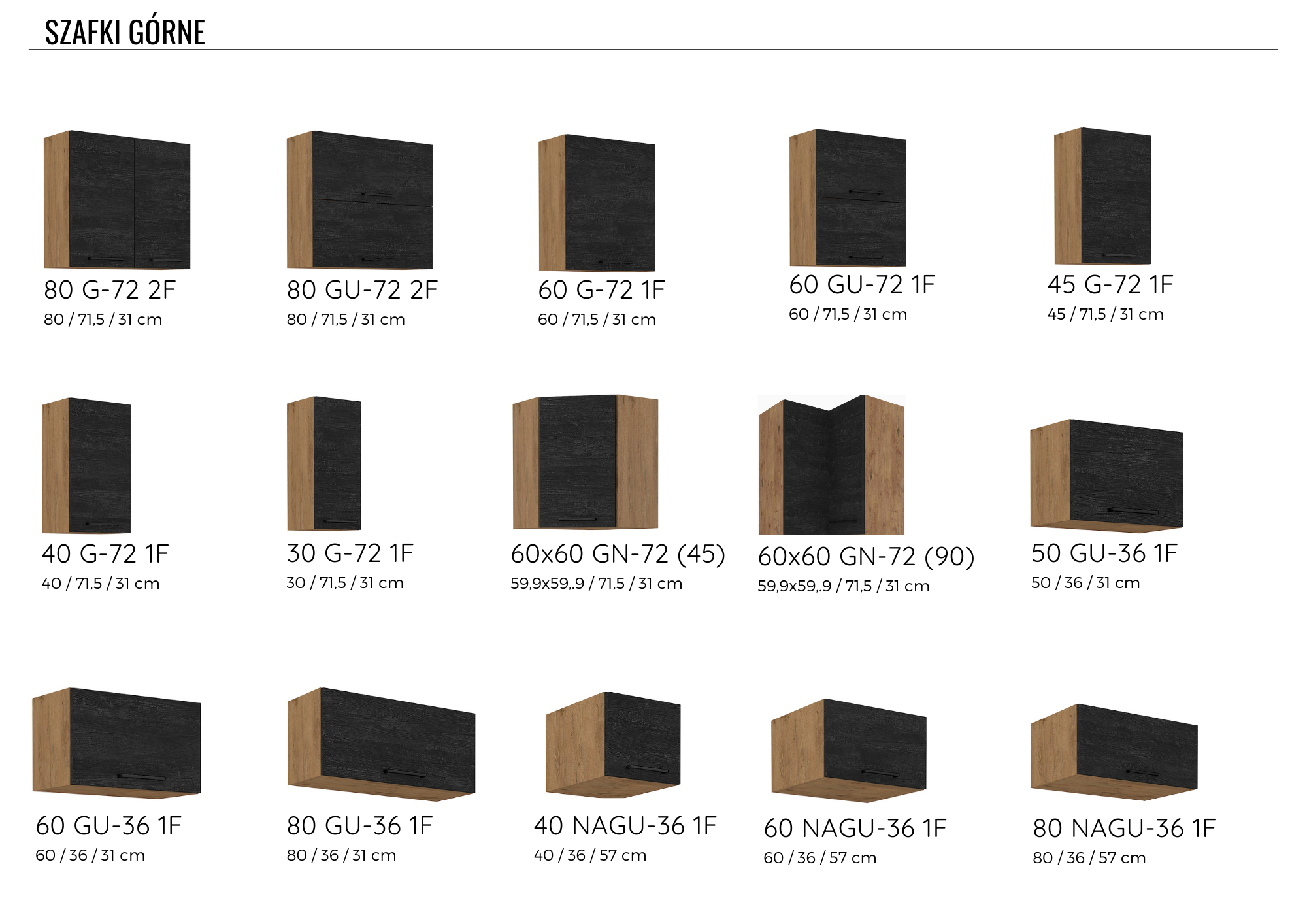 Dzięki uniwersalnemu ustawieniu, meble kuchenne dopasują się do wnętrza każdej kuchni. Dwukolorowe fronty oraz korpusy w dekorze modnego drewna, nadają meblom kuchennym szczególnego charakteru. Czarne metalowe uchwyty podkreślają elegancję szafek kuchennych.