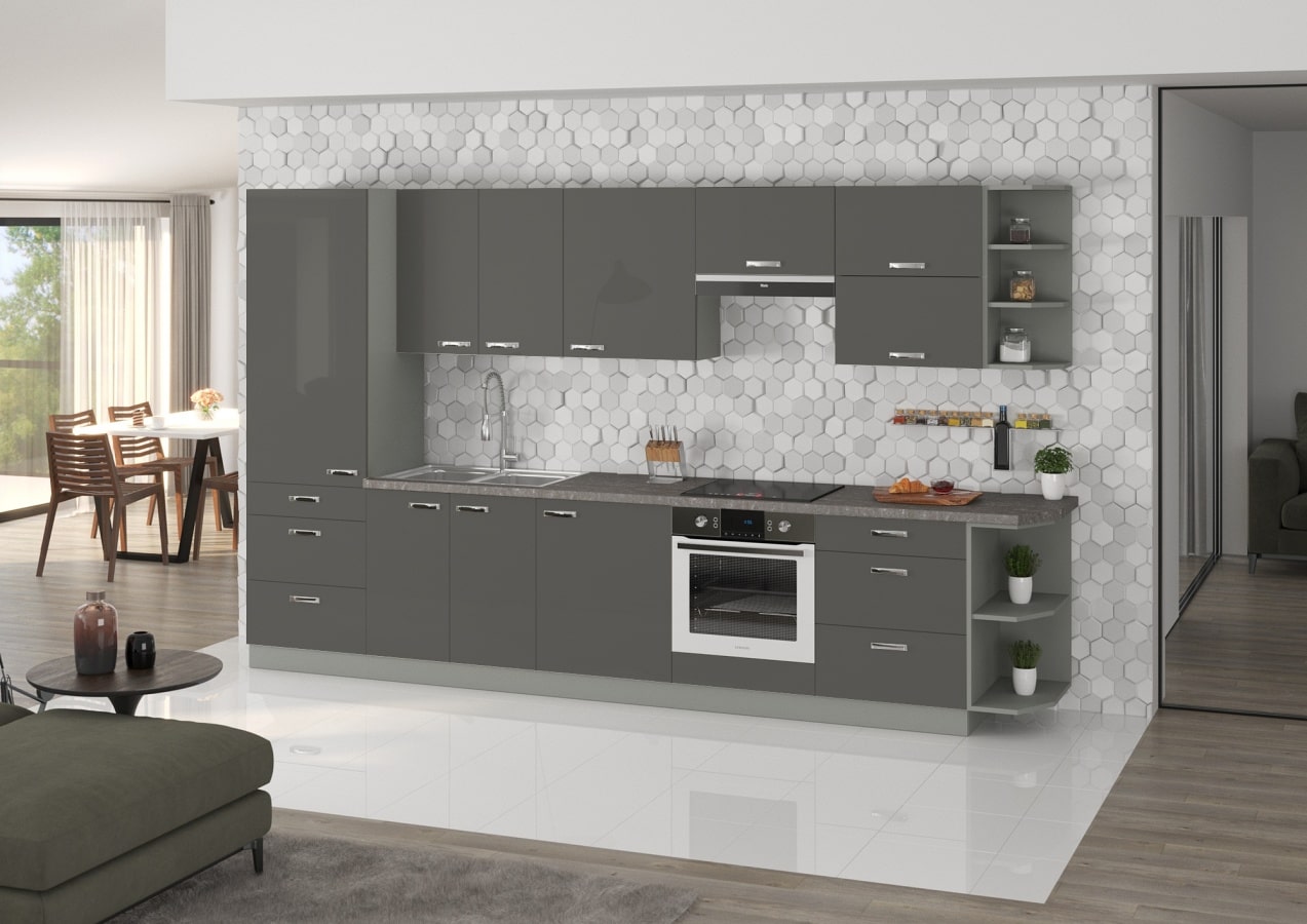 Nowoczesna duża kuchnia Maximus wyróżni się w każdym wnętrzu. Fronty zostały wykonane z płyty PUR i wykończone okleiną ABS, natomiast korpusy szafek wykonane zostały z płyty laminowanej.