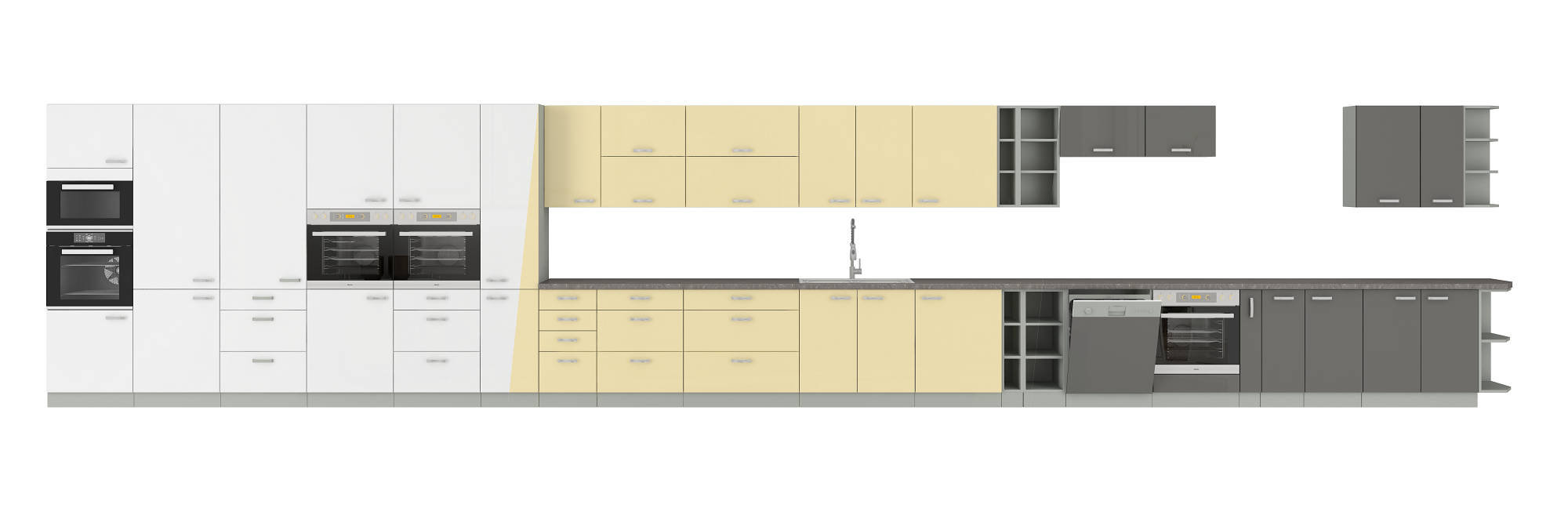Dzięki uniwersalnemu ustawieniu, meble kuchenne dopasują się do wnętrza każdej kuchni. Trzy kolory frontów oraz korpusy w kolorze delikatnej szarości, nadają meblom kuchennym szczególnego charakteru. Chromowane metalowe uchwyty podkreślają elegancję szafek kuchennych.
