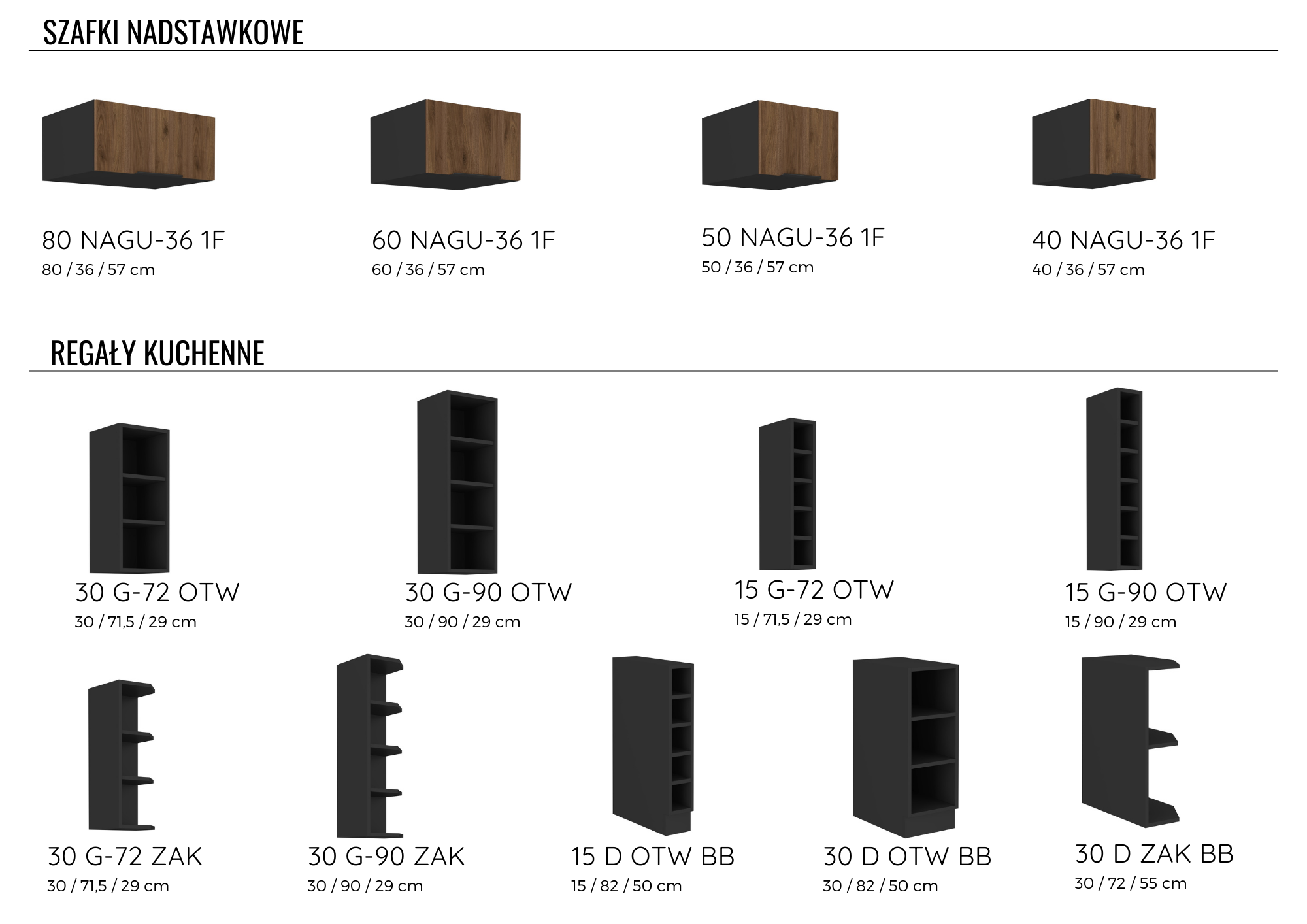 - Korpusy szafek dolnych wykonane z płyty wiórowej laminowanej grubości 16 mm w kolorze czarnym. Głębokość korpusów szafek stojących z frontem – 52 cm.