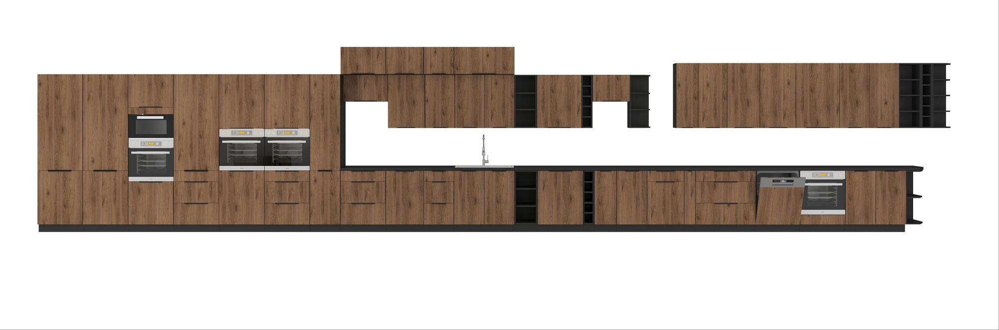 - Korpusy szafek wiszących wykonane z płyty wiórowej laminowanej grubości 16 mm w kolorze czarnym. Głębokość korpusów to 31 cm z frontem. Szafki wiszące posiadają zawieszki regulowane w dwóch płaszczyznach.