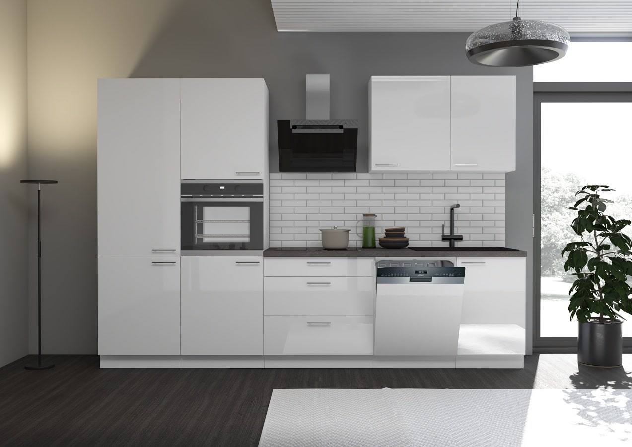 Dzięki uniwersalnemu ustawieniu, meble kuchenne dopasują się do wnętrza każdej kuchni. Trzy kolory frontów oraz korpusy w klasycznej bieli, nadają meblom kuchennym szczególnego charakteru. Chromowane, metalowe uchwyty podkreślają elegancję szafek kuchennych.