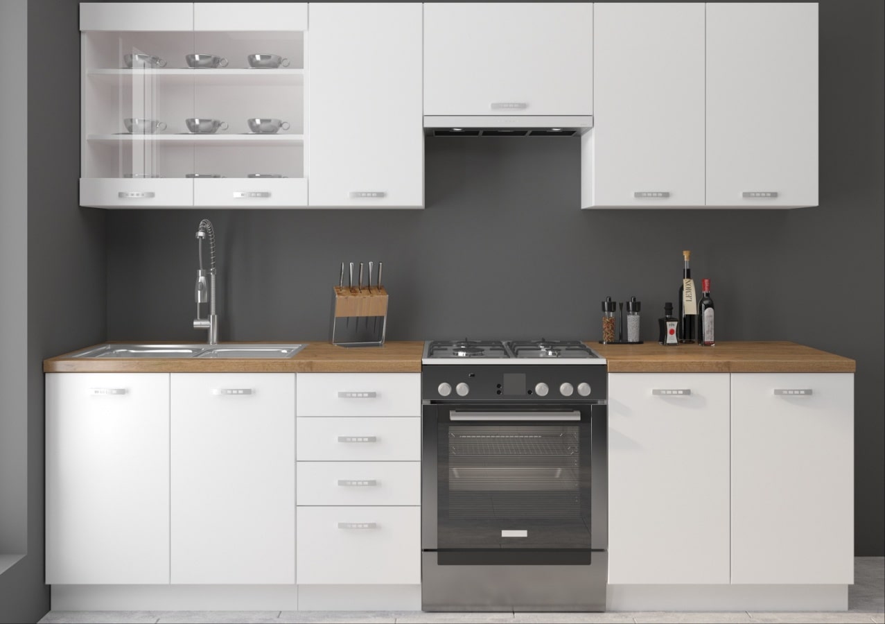 Dzięki uniwersalnemu ustawieniu, meble kuchenne dopasują się do wnętrza każdej kuchni. Klasyczne białe fronty oraz korpusy w tym samym odcieni, nadają meblom kuchennym minimalistycznego charakteru. Srebrne uchwyty podkreślają elegancję szafek kuchennych.