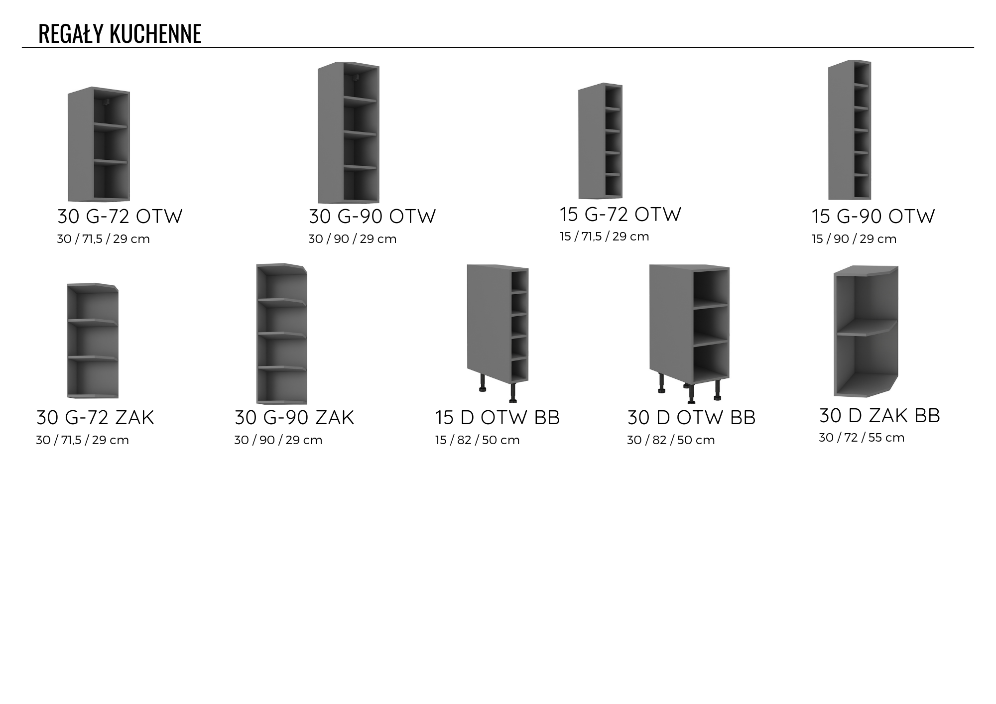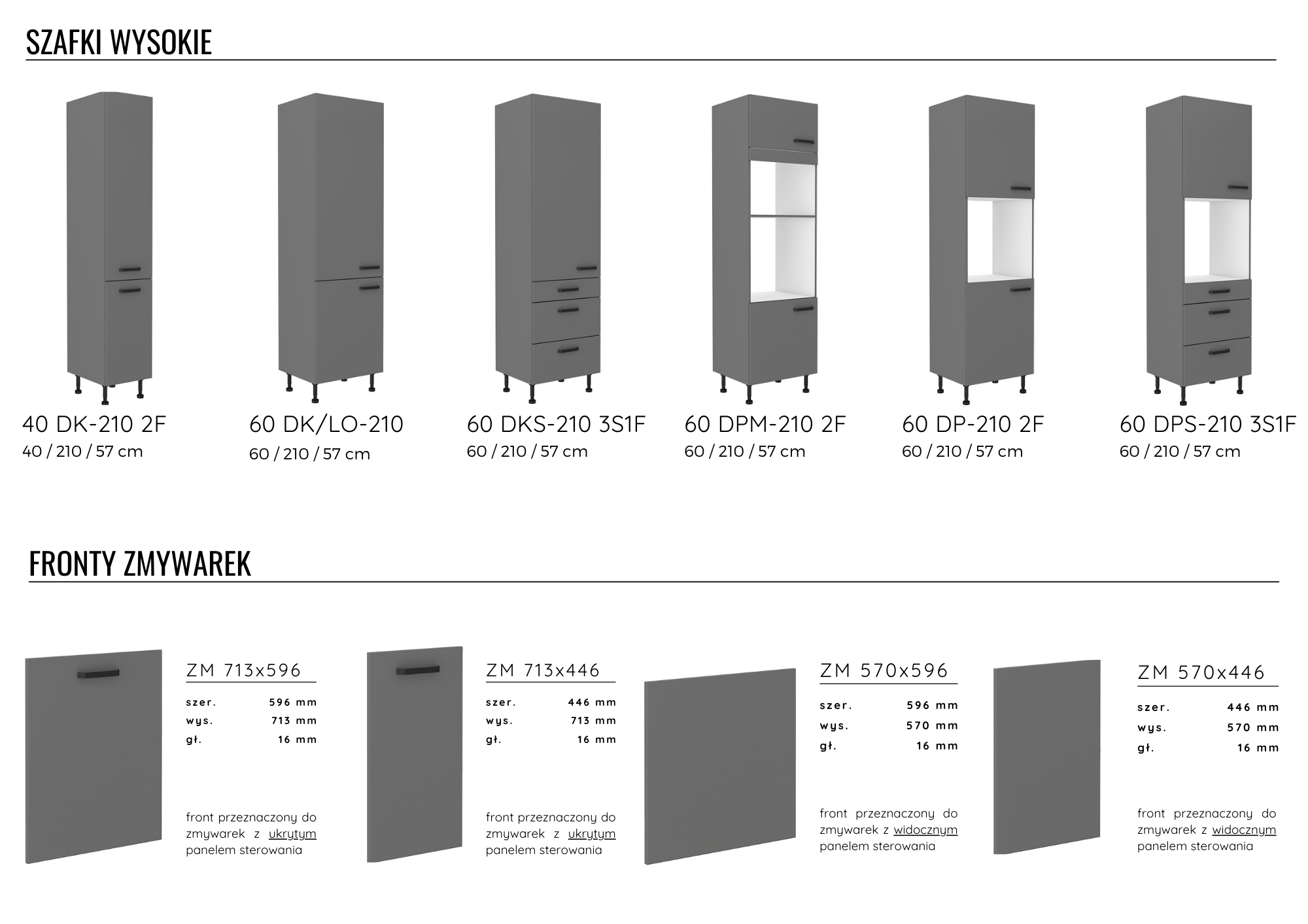 - Korpusy szafek dolnych wykonane z płyty wiórowej laminowanej grubości 16 mm w kolorze antracyt. Głębokość korpusów szafek stojących z frontem – 52 cm.