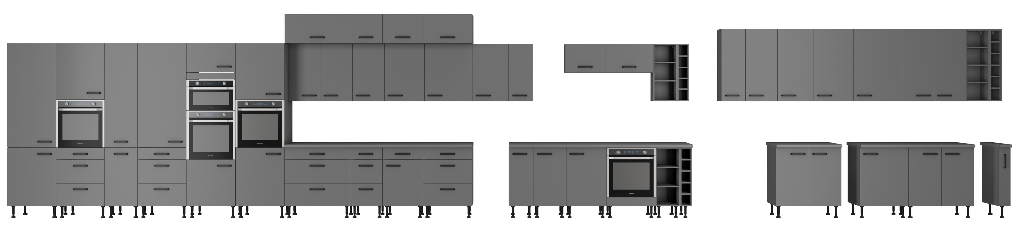 Dzięki uniwersalnemu ustawieniu, meble kuchenne dopasują się do wnętrza każdej kuchni. Całość w monochromatycznym antracycie, nadaje meblom kuchennym niewiarygodnego charakteru. Czarne uchwyty podkreślają elegancję szafek kuchennych.