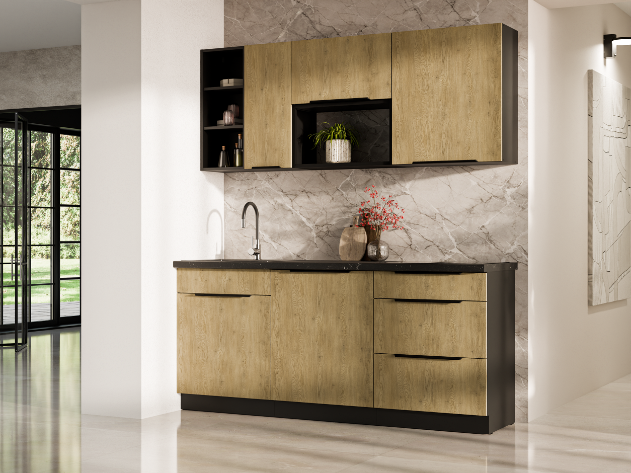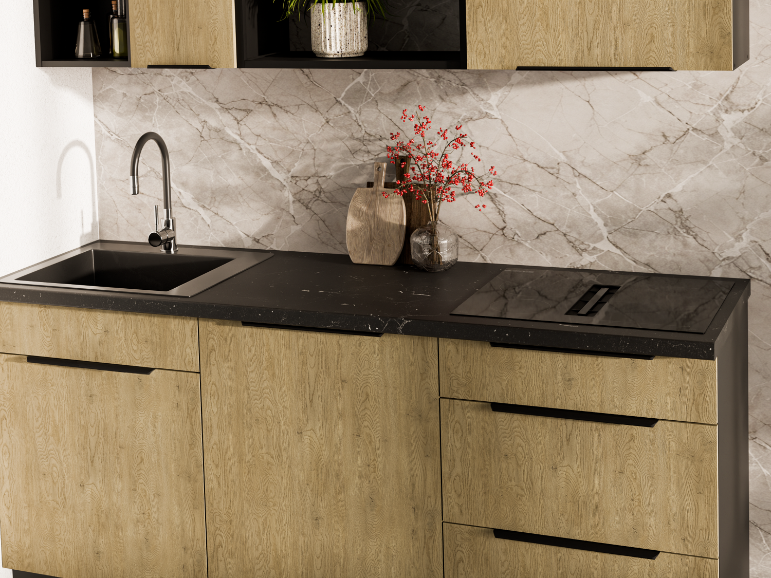 Przede wszystkim każdy element zestawu został wykonany z wysokiej jakości płyty laminowanej, odpornej na wilgoć, wysoką temperaturę oraz codzienne użytkowanie. Dzięki temu meble MURANO są nie tylko piękne, ale także trwałe i funkcjonalne. Całość dopełniają eleganckie uchwyty krawędziowe w kolorze czarnym, które podkreślają nowoczesny charakter kuchni i zapewniają wygodne otwieranie frontów bez zaburzania minimalistycznej formy.