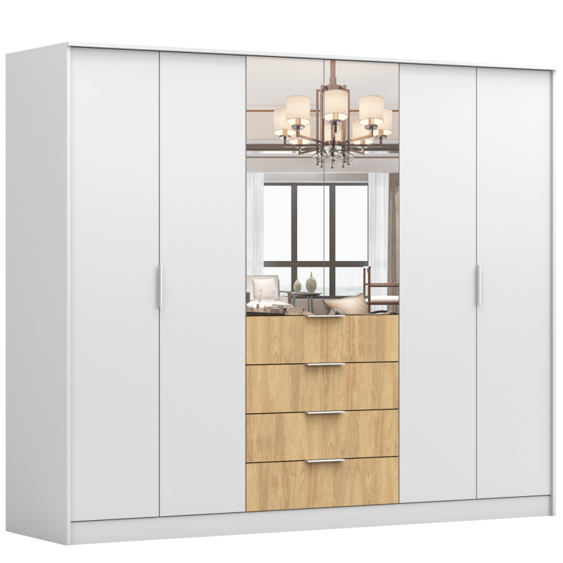 Szafa NESCA Z pewnością Szafa Nesca to idealne połączenie nowoczesnego stylu z wysoką funkcjonalnością, dzięki czemu sprawdzi się zarówno w sypialni, przedpokoju, jak i garderobie. Przede wszystkim już na pierwszy rzut oka zachwyca dużym lustrem na dwóch frontach, które optycznie powiększa przestrzeń oraz srebrnymi uchwytami, dodającymi elegancji. Jej klasycznie otwierane drzwi ułatwiają dostęp do wnętrza,…