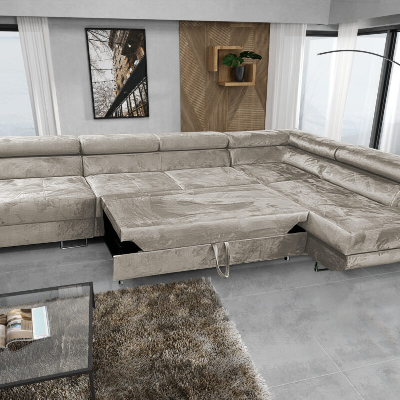 Narożnik z funkcją spania SEVILLA U Bez wątpienia narożnik z funkcją spania SEVILLA U to eleganckie połączenie stylu i praktyczności, które doskonale sprawdzi się w każdym nowoczesnym salonie. Dzięki systemowi rozkładania DL narożnik z łatwością zamienia się w wygodne miejsce do spania. Dodatkowo pojemnik na pościel pozwala na przechowywanie niezbędnych tekstyliów, zachowując porządek w pomieszczeniu….
