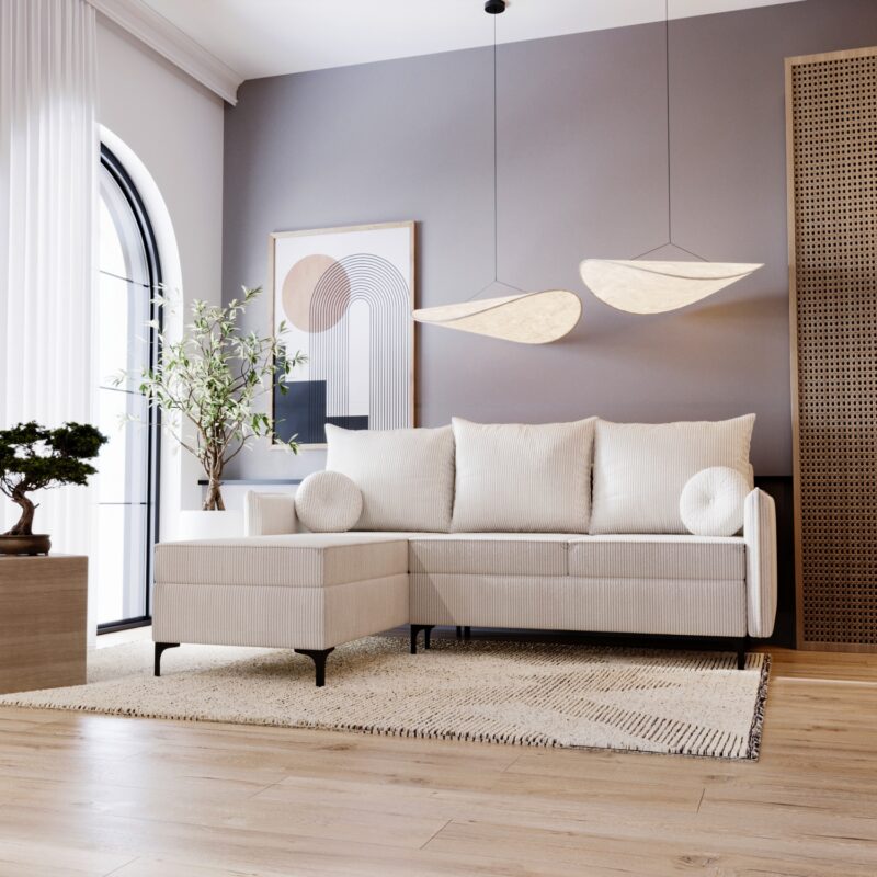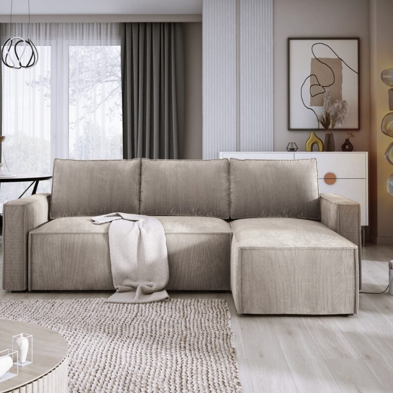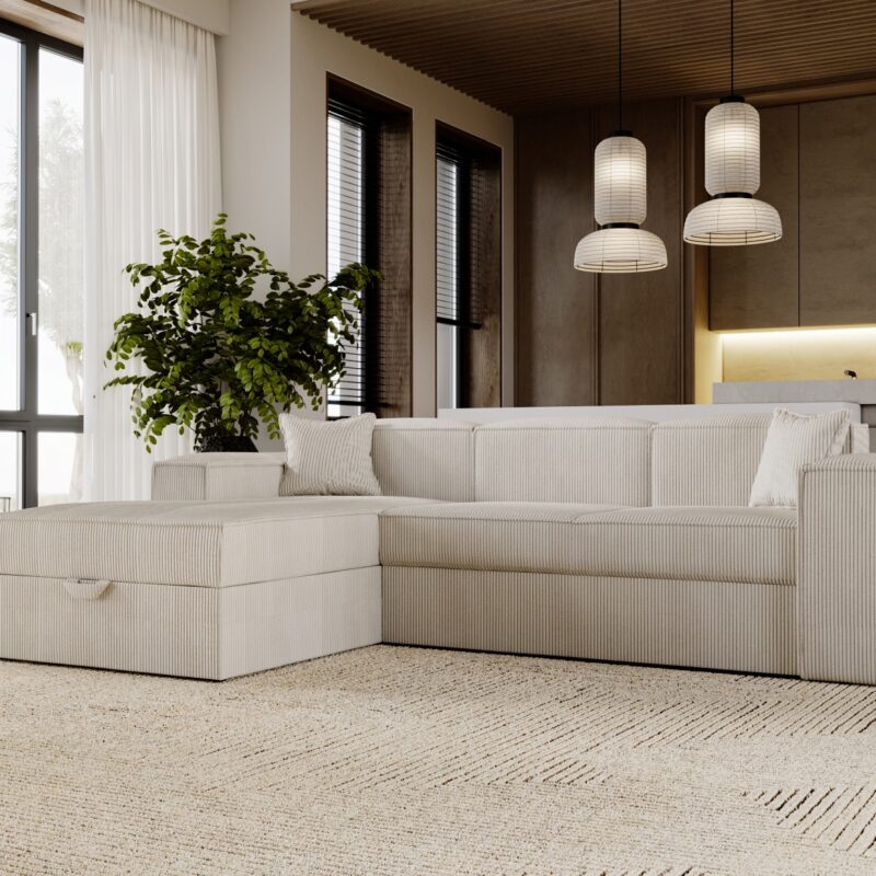Narożnik z funkcją spania PALERMO Bez wątpienia Narożnik Palermo to propozycja, która łączy klasyczny design z nowoczesnym wykończeniem, dzięki czemu doskonale wpisuje się w aktualne trendy wnętrzarskie. Pokryty modną tkaniną sztruksową, zachwyca wyjątkową fakturą oraz przytulnym charakterem, który sprawia, że wnętrze staje się bardziej stylowe i komfortowe. Dzięki temu mebel świetnie odnajdzie się zarówno w…